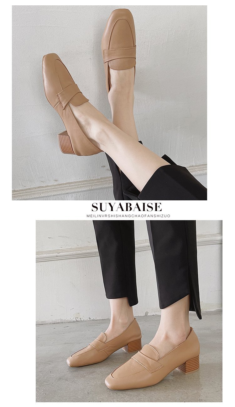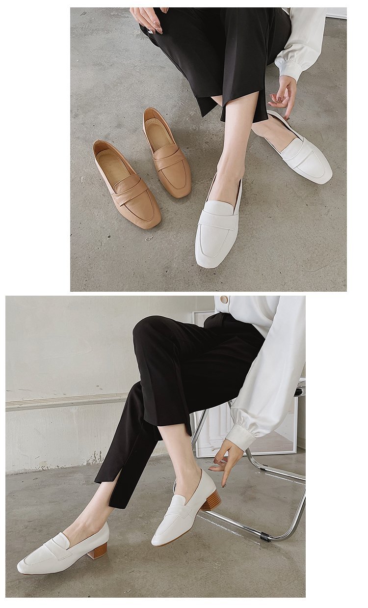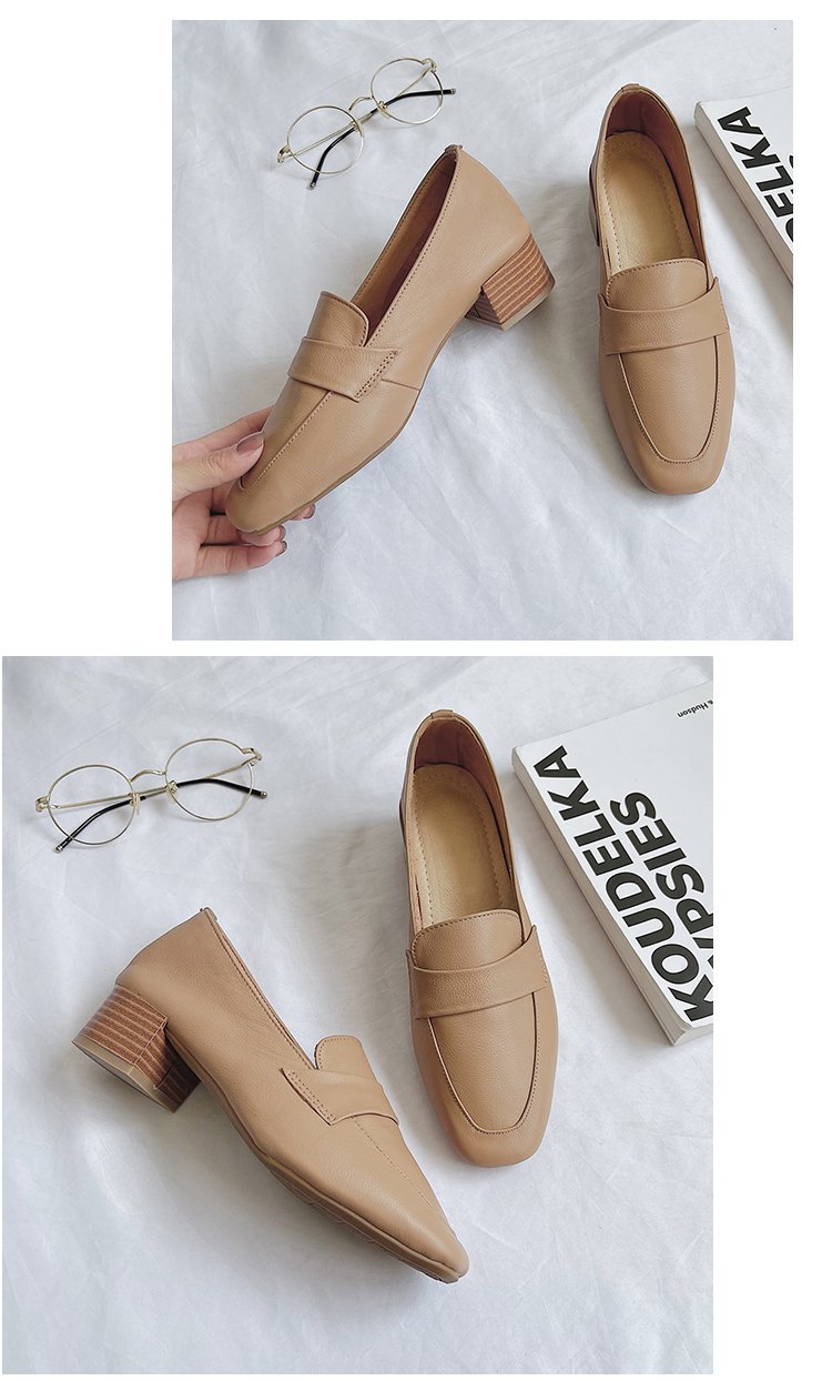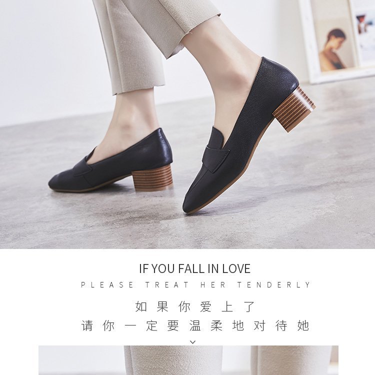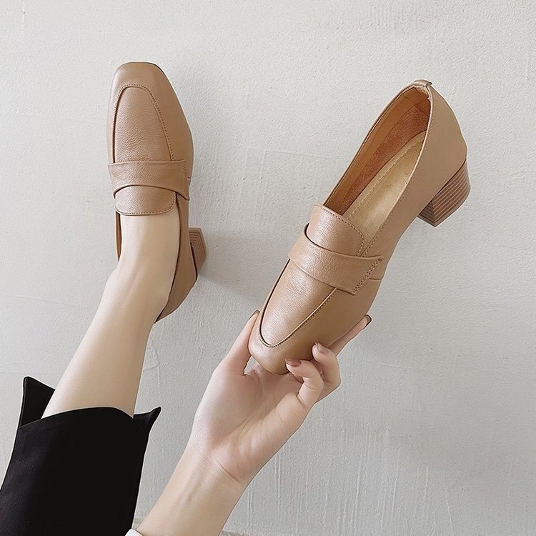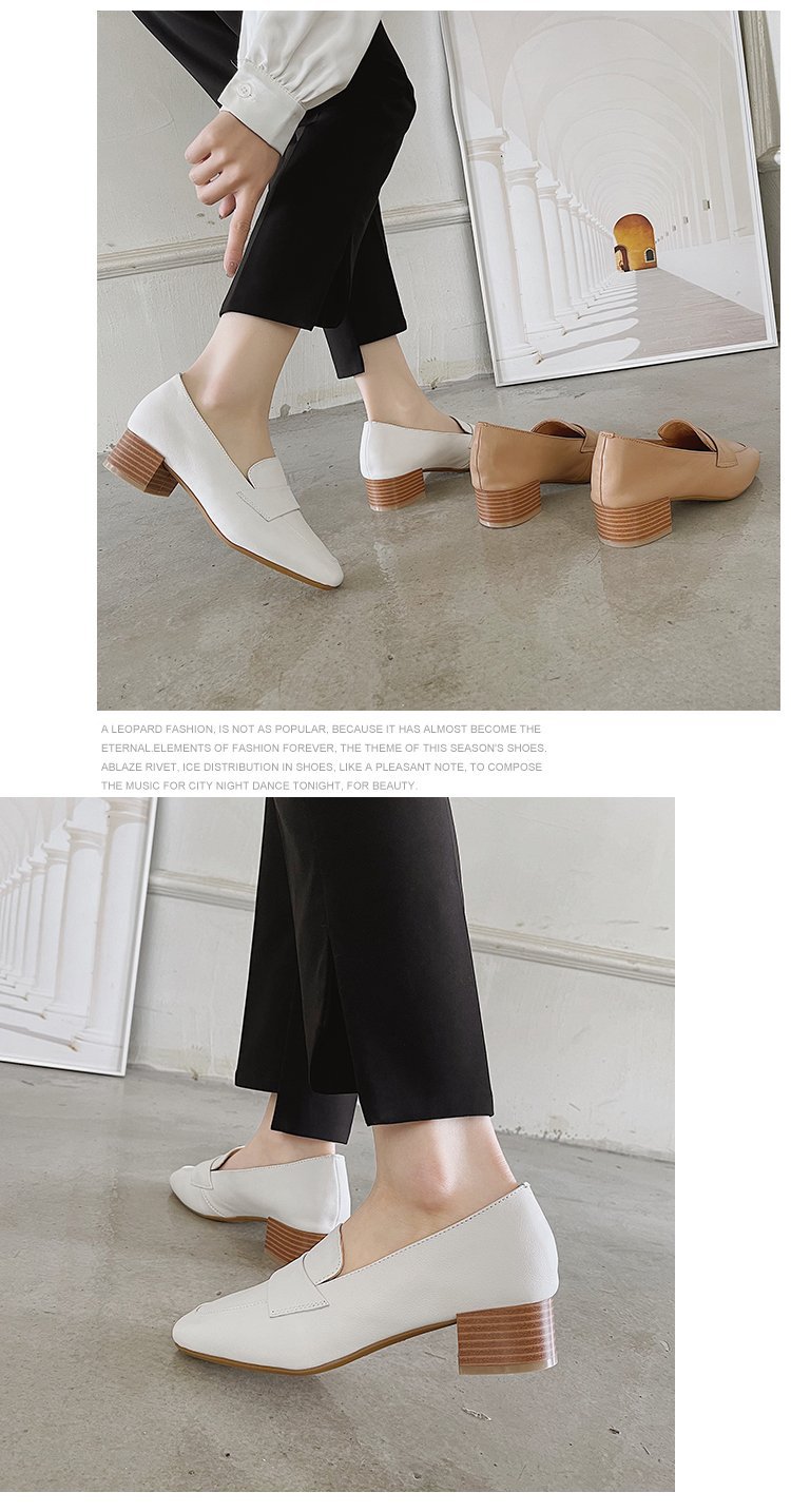 Chunky Heel Pumps Women's 2021 Spring and Autumn New Korean Style Mid Heel Loafers Slip-on Leat